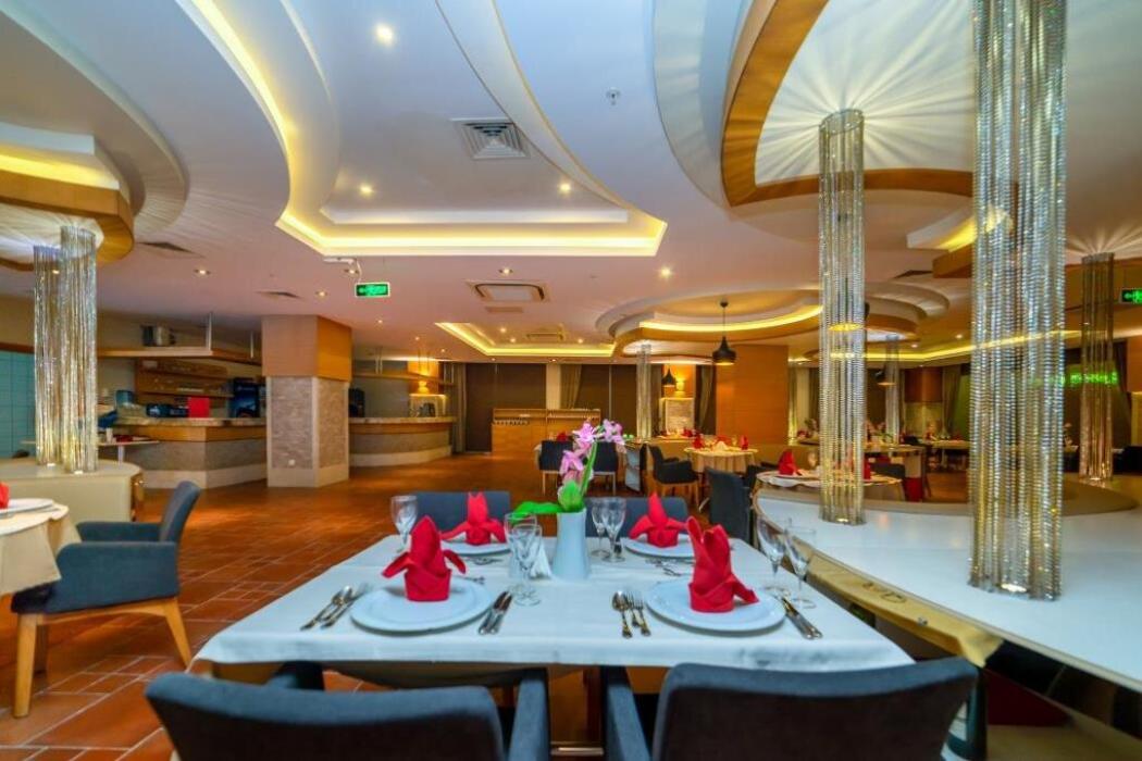 | Konaklama Açıklaması: | Her Şey Dahil Ana Restoran 07:30 - 10:00 Sabah Kahvaltısı  12:30 - 14:00 Öğle Yemeği  10:00 - 10:30 Geç Kahvaltı  19:00 - 21:00 Akşam Yemeği  00:00 - 00:30 Gece Çorbası  Snack Barlar 12:00 - 15:00 Snack Bar  11:00-18:30 Çay Saati  A La Carte Restoranlar 19:00-21:00 İtalyan A La Carte  Barlar 09:30 - 00:00 Lobby Bar  09:30 - 17:30 Havuz Bar  10:00 - 19:00 Vitamin Bar ( Ücretli ) 00:00 - 03:00 Disco Bar ( Ücretli ) Ücretsiz içecekler   : Yerli alkollü ve alkolsüz içecekler.  Ücretli içecekler : Yabancı içecekler yerli ve ithal özel şaraplar taze sıkma meyve suları şişeli içecekler. |