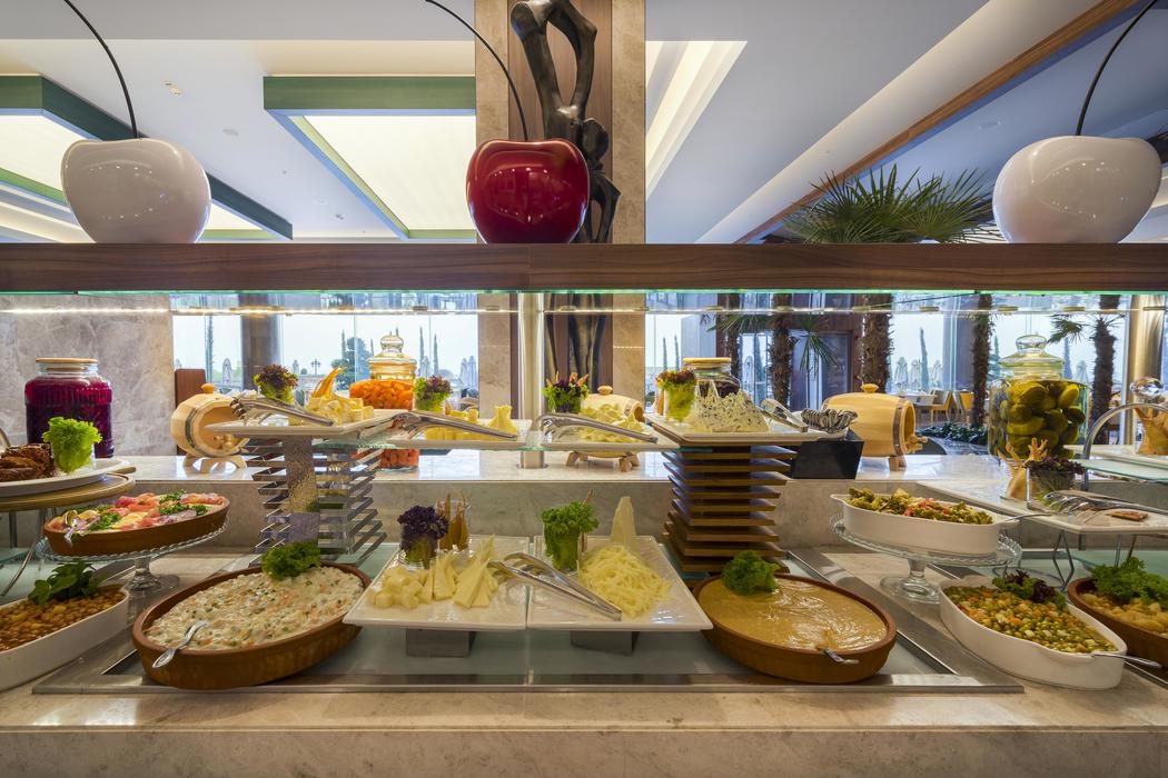 | Konaklama Açıklaması: | Ana Restoran 07:00 - 11:00 Kahvaltı 12:30 - 14:30 Öğle Yemeği 18:30 - 21:00 Akşam Yemeği 17:00 - 18:00 Çay Saati 00:00 - 07:00 Gece Büfesi 24 Saat - All Day Bistro (Ücretli)(Dünya Mutfağı) Pastane ( Ücretli ) Barlar 24 Saat Bellini Lobby Bar 24 Saat Havana Social Lounge 16:00 - 24:00 Champions Sports Bar 23:00 - 01:00 O2 Night Club 08:00 - 20:00 Sentre Vitamin Bar (Tüm Taze Sıkılmış Meyve Suları, Detoks İçecekleri ve Özel Çaylar Ücretlidir) A La Carte Restaurantlar ( Ücretli ve Rezervasyonlu ) 18:30 - 23:00 İtalyan Mutfağı A'la Carte Restoran 18:30 - 23:00 Uzak Doğu Mutfağı A'la Carte Restoran 18:30 - 23:00 Steak Mutfağı A'la Carte Restoran Konsept Bilgilendirmesi Haftanın belirli günleri A'la Carte hizmeti bulunmaktadır. Tüm taze sıkılmış meyve suları, detoks içecekleri ve özel çaylar ücretlidir. Tesis doluluğa istinaden, tüm saatlerde değişiklik yapabilir. Güncel saatler, girişte tesisten alınabilecek broşürlerde mevcut olacaktır. Kış döneminde dolulukla bağlantılı olarak sabah, öğle ve akşam yemekleri açık büfe yerine serpme kahvaltı, öğle ve akşam yemeleri ise set menü olarak A'la Carte restoranda servis edilebilir. |