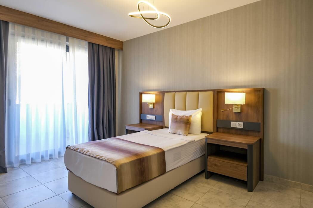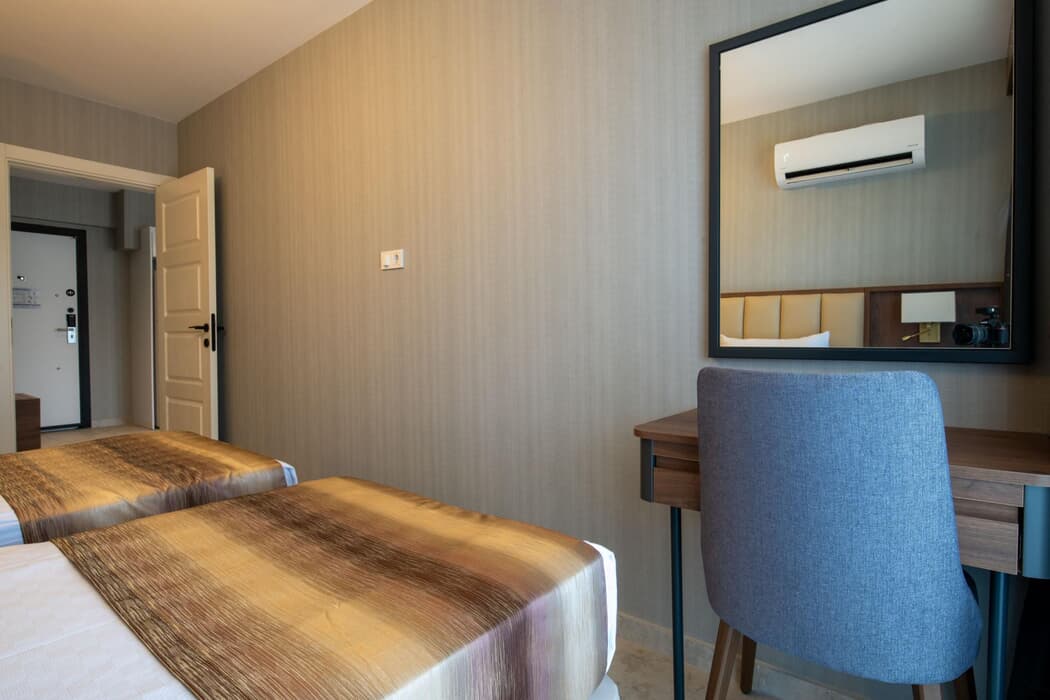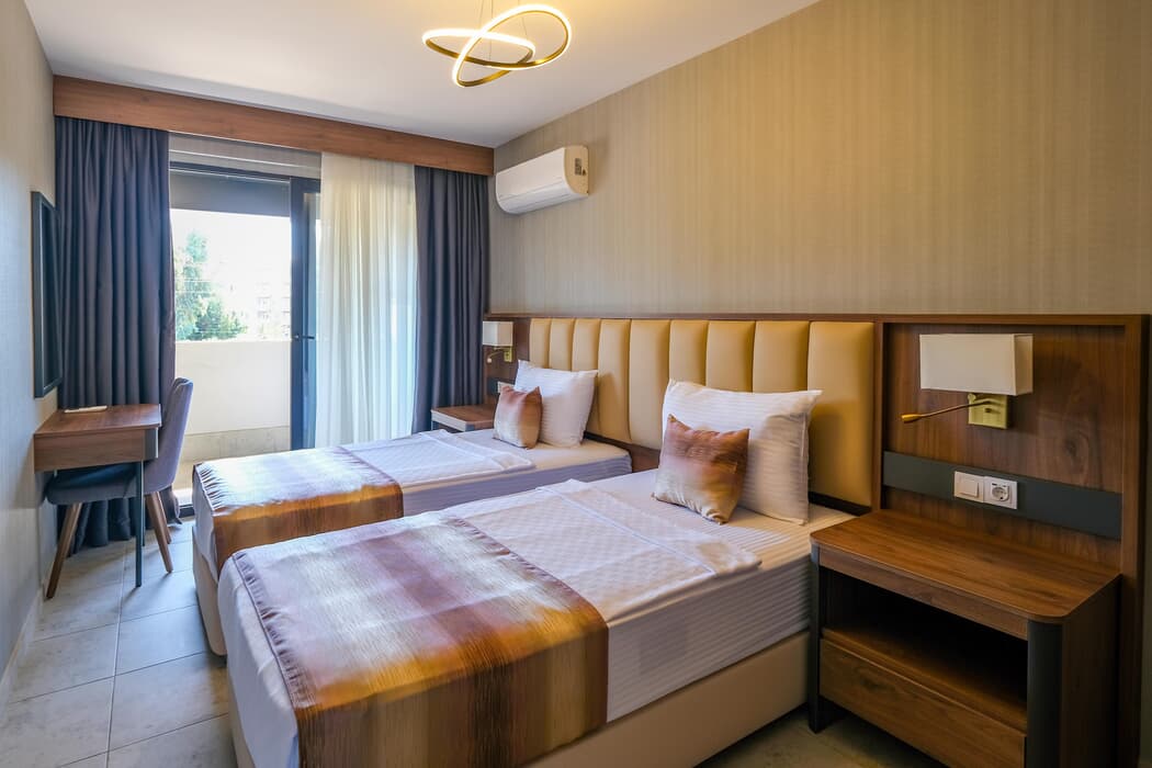 Açıklama: A: 2 adet tek kişilik yatak B: 1 adet çift kişilik yatak TV (uydu yayını), Split Klima, Duş-WC, Saç Kurutma Makinesi, Odada Telefon, Buzdolabı (soft içecekler), Çay Kahve Seti, Kasa, Balkon Mevcuttur.