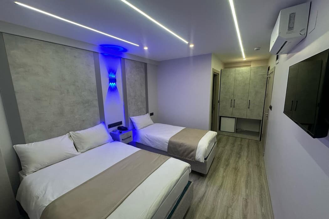 Açıklama: Dilara Hotel’in konforlu ve geniş aile odaları, 3 kişilik konaklamalar için ideal bir seçenektir. 1 çift kişilik ve 1 tek kişilik yatak düzenine sahip odamız, hem aileler hem de arkadaş grupları için rahat ve kullanışlı bir konaklama sunar.