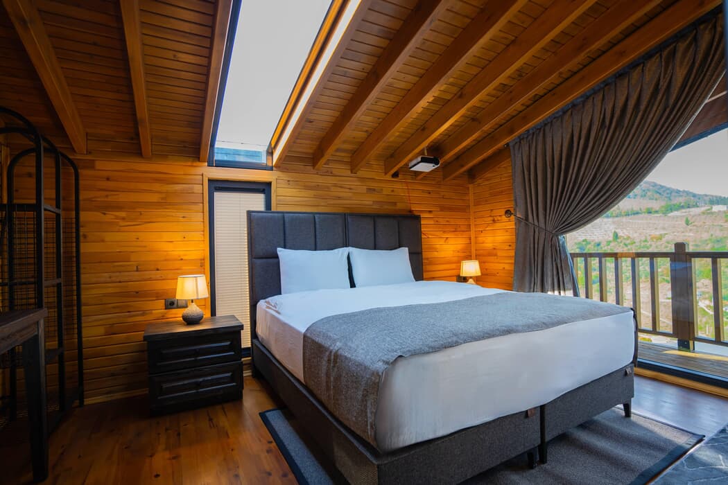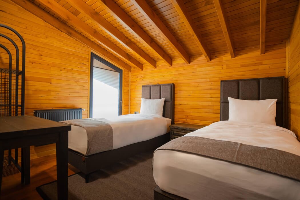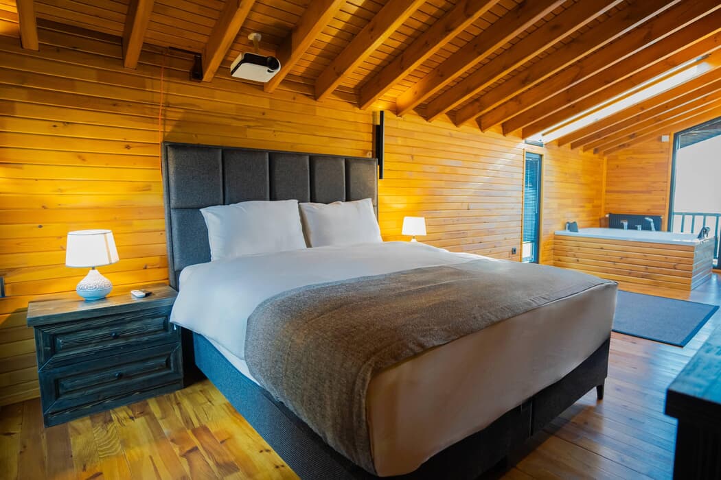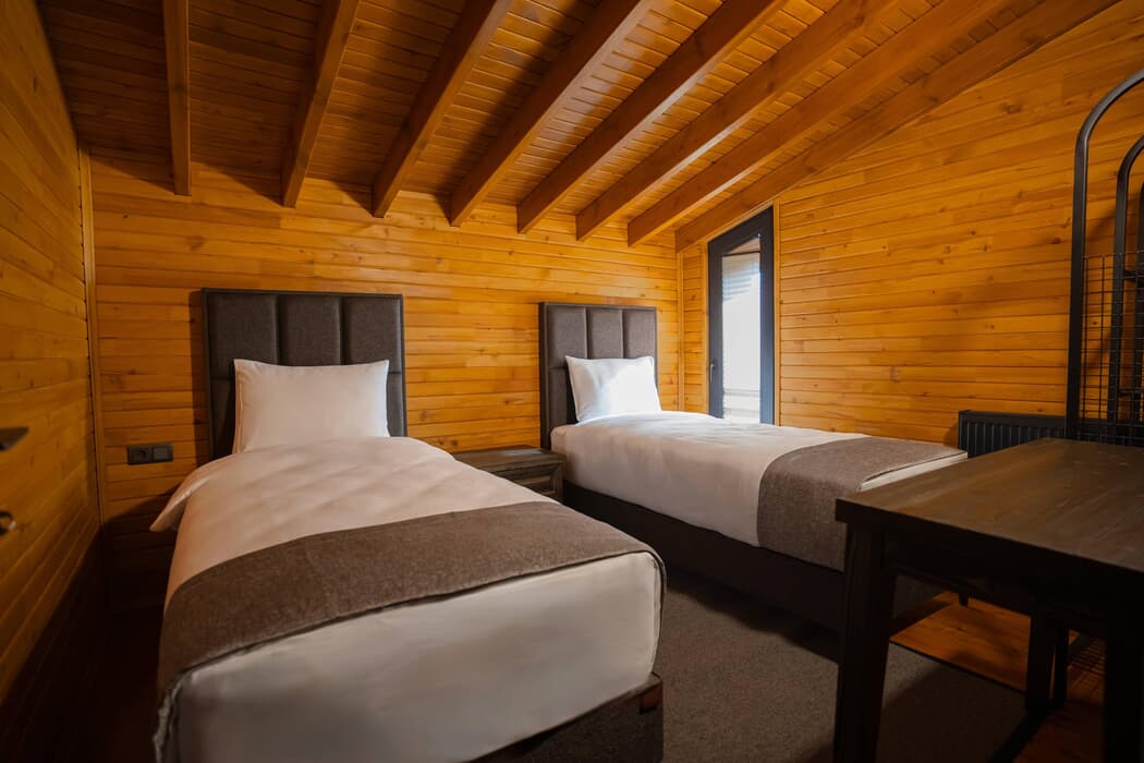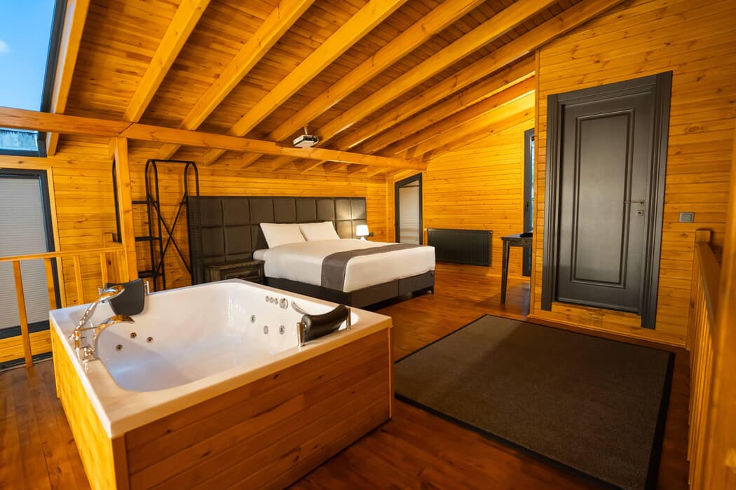 Tamamı ahşap mimaride inşa edilmiş, jakuzili, şömineli ve sinema sistemli özel bungalovlar; dört mevsim konforu sunan kaloriferli ısıtma ve klima sistemleriyle donatılmıştır.