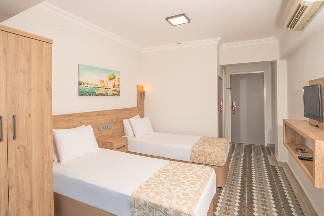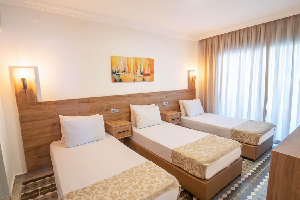Açıklama: Tamamı balkonlu ve kısmi deniz manzaralı standart 3 kişilik odalarımız sade ve konforlu bir konaklama sunar. Odalarda 3 adet tek kişilik yatak bulunmaktadır. Ayrıca, wi-fi, karo zemin, balkon, masa sandalye, duş/WC, saç kurutma makinası, klima, mini buzdolabı, kasa ve gardırop bulunmaktadır. Banyoda şampuan, sabun, terlik ve havlu bulunmakta olup, plaj havlusu verilememektedir.