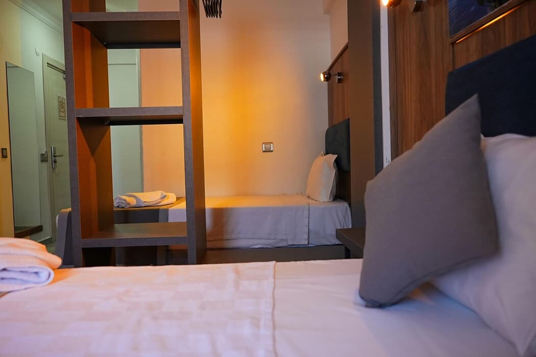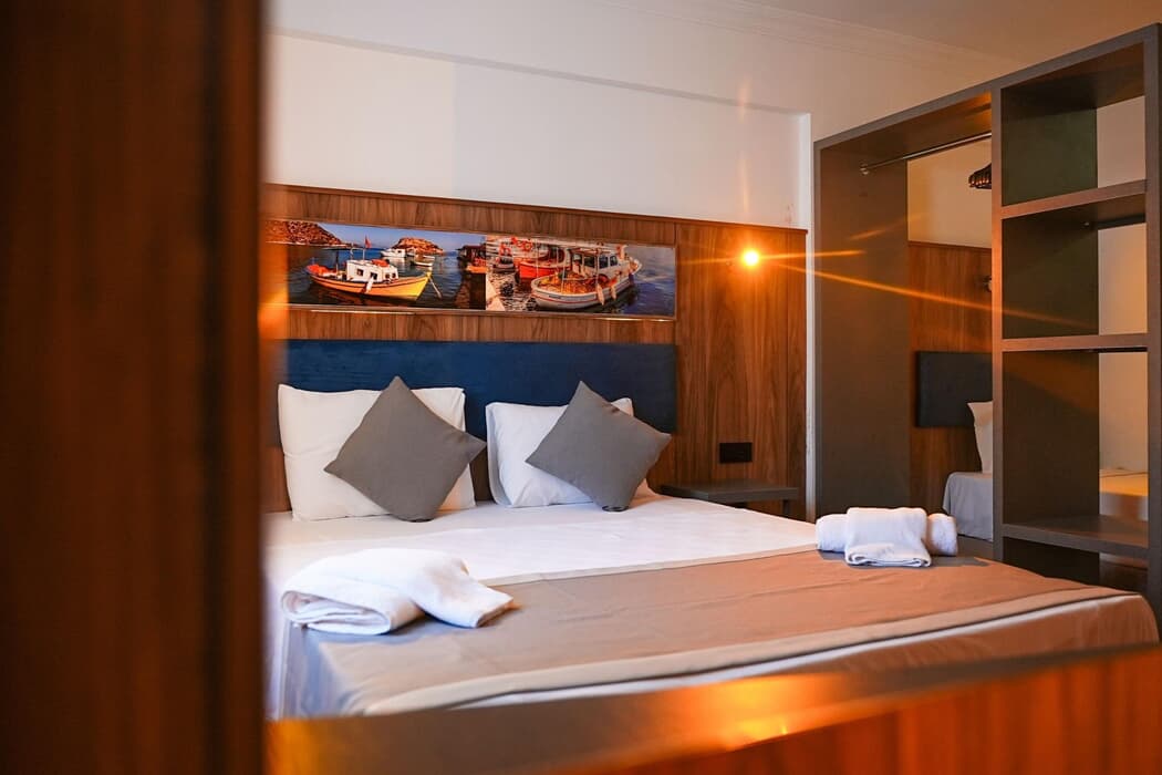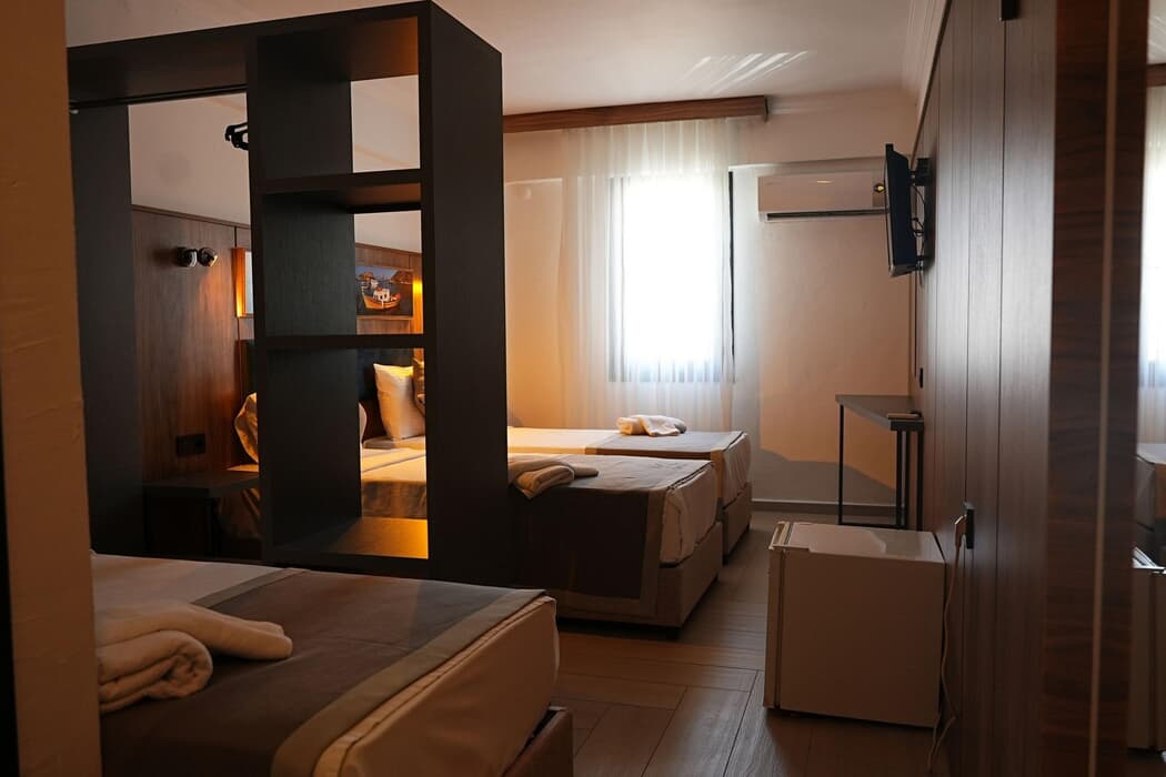 Açıklama: Standart Room, samimi atmosferiyle hem çiftlerin hem de küçük ailelerin kendini rahat hissedeceği bir alan sunar.?22 m² genişliğindeki bu odalarda French veya Twin yatak seçeneği bulunur; minimum 1, maksimum 2+1 veya 3 kişilik kapasitesiyle esnektir.?Kara veya bahçe manzaralı, balkonsuz ama ferah bir yapıya sahip odalarımızda tüm temel konforlar mevcuttur: klima, modern duşlu banyo (WC), TV ve mini bar.