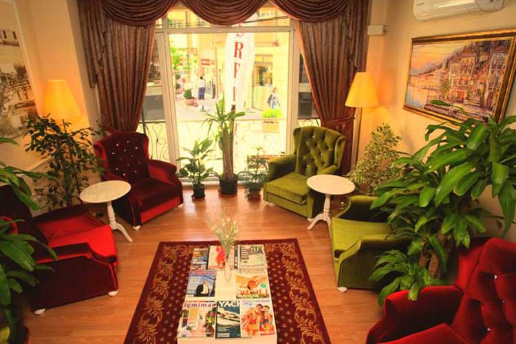 Sıcak renklere sahip olan otel lobisi, bir şeyler okumak ve sosyalleşmek için rahat bir yer sunmaktadır.