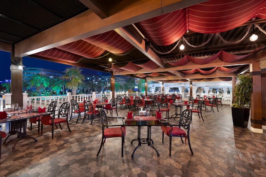 | Konaklama Açıklaması: | Deluxe Her Şey Dahil ( 01.04.2026 - 31.10.2026 ) Ana Restoran 07:00-10:00 Kahvaltı 10:00-11:00 Geç Kahvaltı 12:30-14:30 Öğle Yemeği 19:00-21:30 Akşam Yemeği 23:00-01:00 Gece Büfesi 01:00-07:00 Gece Atıştırmalığı Çocuk Restoranı 07:00-10:30 Kahvaltı 12:30-14:30 Öğle Yemeği 19:00-21:30 Akşam Yemeği 11:00-17:00 Simit Evi 12:00-17:00 Sueno Meydanı ( Pastane, Kahve dünyası, Meyve büfesi, Tantuni, Tavuk dünyası, Balık, Kumpir, Salata, Pizza, Makarna, Hamburger & Sandviç, Ekmek & Pide, Börek, Döner, Asya Mutfağı, Türk Mutfağı ve Corner Bar) 12:00-23:00 Pastane 15:00-16:00 Lollipop Çocuk Kulübü Vitamin Bar Barlar 08:00-16:00 Buggy Bar (ücretli) 08:30-00:00 Lobi Bar 08:30-00:00 Teras Bar 08:30-00:00 Türk Kahvesi 09:00-16:00 Relax Bar 09:00-19:00 Plaj Bar 09:00-19:00 İskele Bar 09:00-00:00 Snack Bar 09:00-20:00 Vitamin Bar 09:00-00:00 Havuz Bar 10:00-19:00 Vitamin Bar 11:00-17:00 Club House Birdie Bar (dışardan misafir kabul ediliyor) 12:00-17:00 Corner Bar 12:00-00:00 Eğlence Dünyası Barı 22:30-00:00 Beach Club 24 Saat Lounge Bar Konsept Bilgisi A la carte restoranlar rezervasyonlu ve kişi başı kuver ücretli. A la carte restoranlar 0-6 yaş çocuklar misafirler için ücretsiz, 7-12 yaş çocuk misafirler için ise %50 indirimli. Aynı anda sadece 1 a la carte restoran için rezervasyon yapılabilir. Balık ve Barbekü A La Carte Restoranlar 1 Mayıs-31 Ekim tarihleri arasında hizmet veriyor. Minibar giriş günü 2 adet bira, 2 adet soğuk çay, 18,75 cl beyaz ve kırmızı şarap, 2 adet kola light, 2 şişe soda, 2 adet kola, 2 adet fanta, 2 adet gazoz, 2 şişe su, 2 şişe meyve suyu, fıstık, çikolata, cips ve kraker ile ücretsiz dolduruluyor ve günlük olarak yenileniyor. |