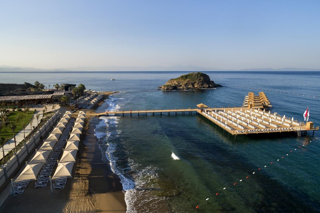 Sunis Efes Royal Palace Hotel Spa denize sıfır konumuyla dikkat çekmektedir. 300 m uzunluğundaki sahile sahip tesisin kendine ait iskelesi vardır. Tesisin kendine özel plajı, kum ve çakıldan oluşmaktadır.